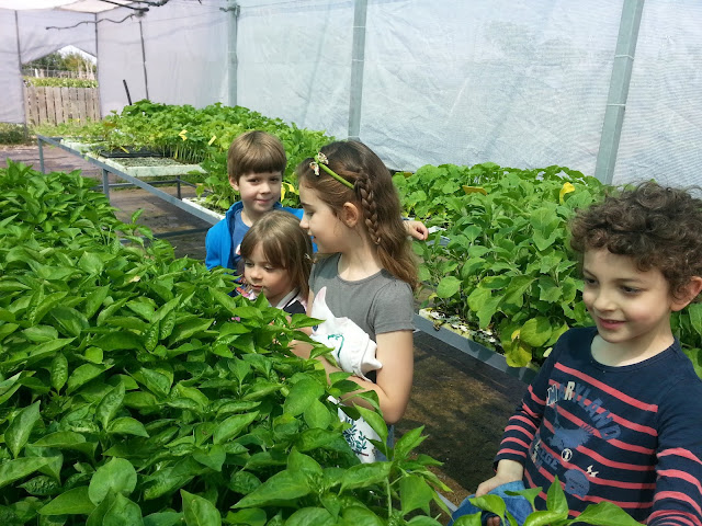 En la zona del invernadero Gael, Araceli, Cloe y Andrés revisan el crecimiento de los pimientos.